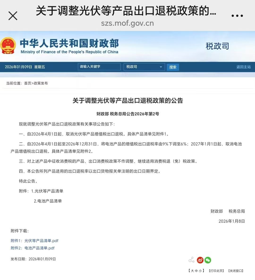 Announcement No. 2 [2026] of the Ministry of Finance and the State Taxation AdministrationMatters concerning the adjustment of the export tax rebate policy for photovoltaic and other products are hereby announced as follows: