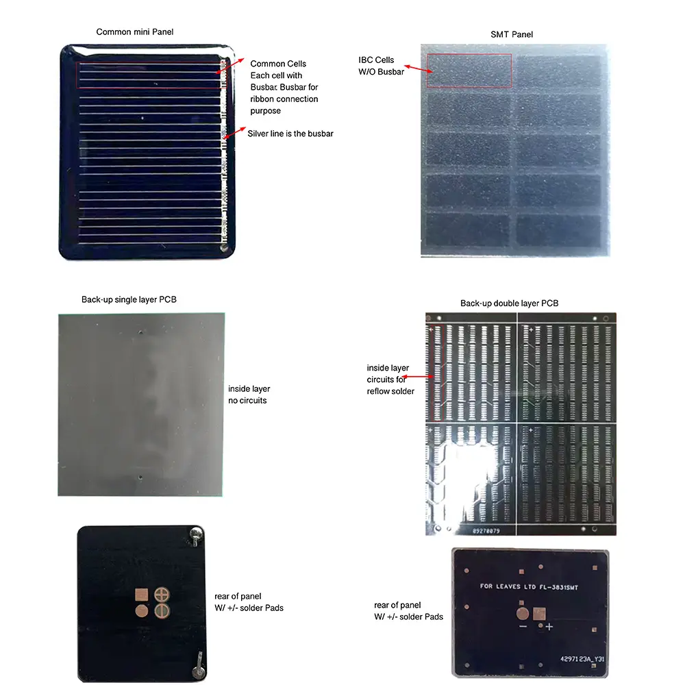 The disadvantage of SMT technology is the high cost of sample production, which includes expenses such as SMT machine and stencil fees, making it less cost-effective for small-batch orders. Nevertheless, it is suitable for very small-sized solar panels requiring high output voltages, where traditional cell cutting and soldering processes are not feasible. SMT panels can achieve thinner profiles, as thin as 1mm, and smaller sizes, such as 10mm x 10mm or smaller. Moreover, SMT can be applied to Flexible Printed Circuits (FPCs), providing certain flexible functionalities.
